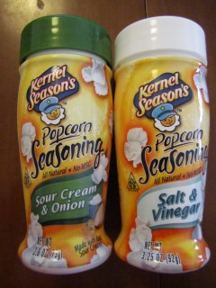 I like to make my own spices mix with chilli and black pepper, but I’ve found this tasty seasoning for the popcorn, Kernel Season’s.