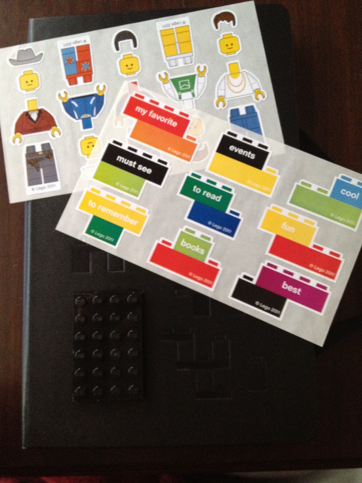 I have the big ruled notebook, it comes attached with a Lego plate on the cover, and some lego minifigures and brick stickers.