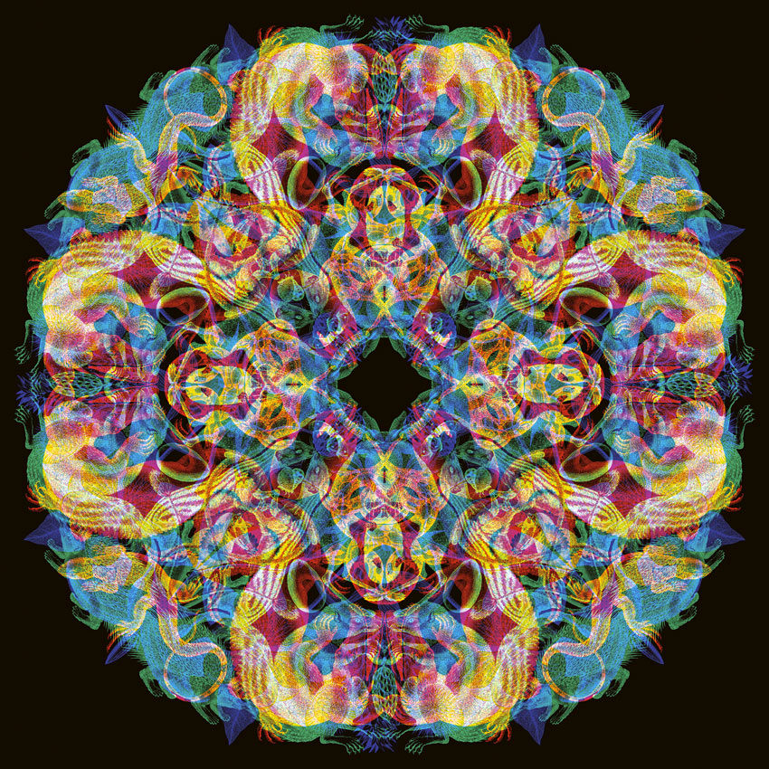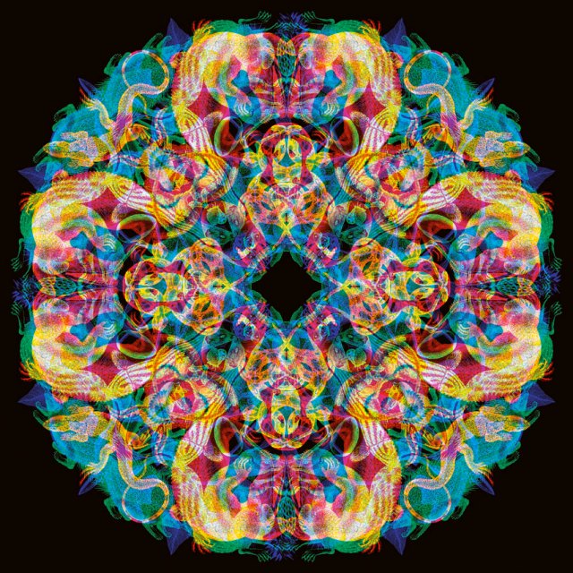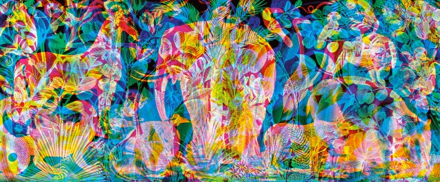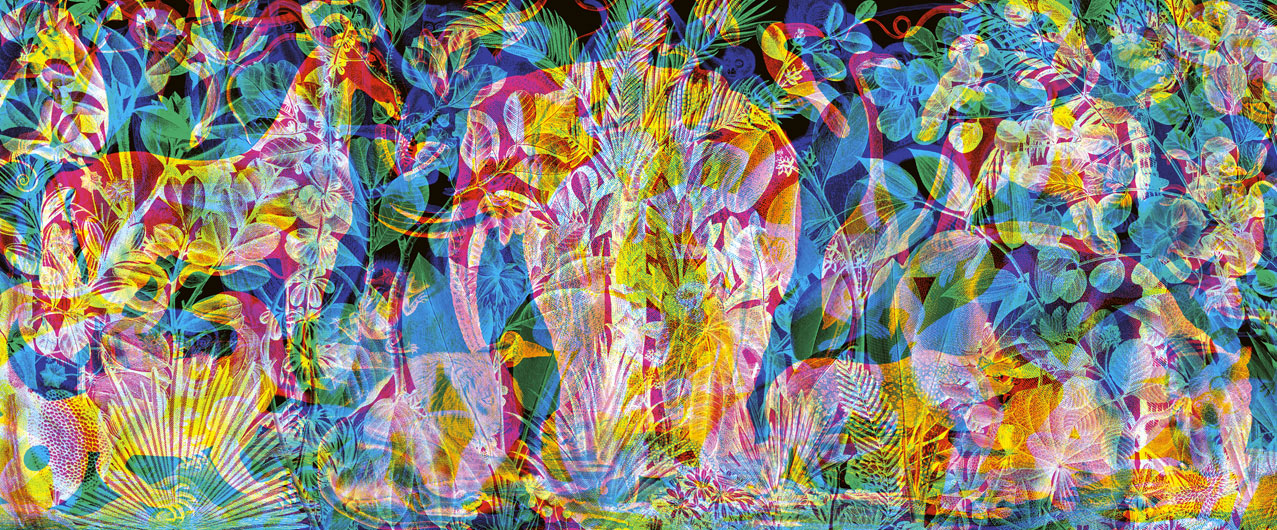 Carnovsky, use their trademark RGB (red, green,blue) technique paired with a variety of intersecting and overlapping insect, animal and foliage illustrations, and these patterns become completely different animals when under specific lighting.