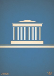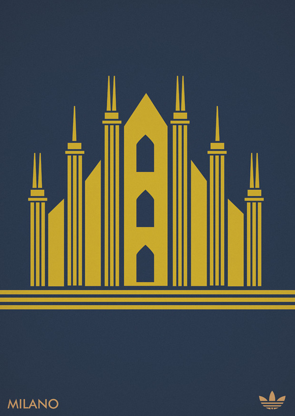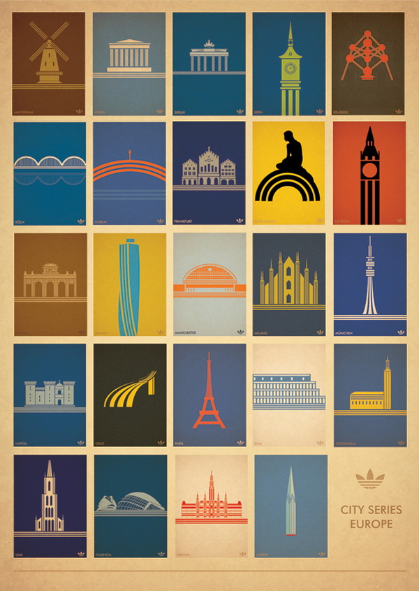 The concept was to give a vintage feel, to the vintage collection (70’/80’s) of trainers. Incorporating the ‘three stripes’ in to graphic illustrations of landmarks of each european city.