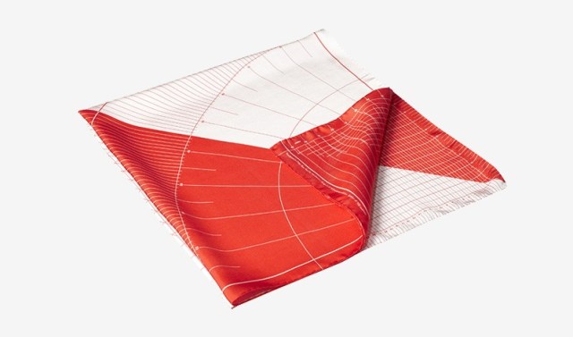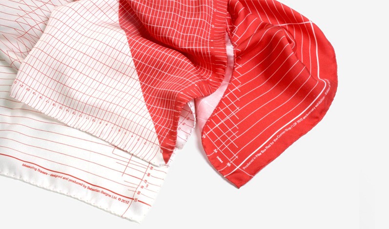 Measuring Square is a silk scarf that further explores Sebastian Bergne interest in unusual measuring devices. The pattern is generated by the grid formed when centimeters, inches and degrees coincide. This is printed onto the delicate and flexible silk surface resulting in a beautiful scarf that is part functional and part decorative.