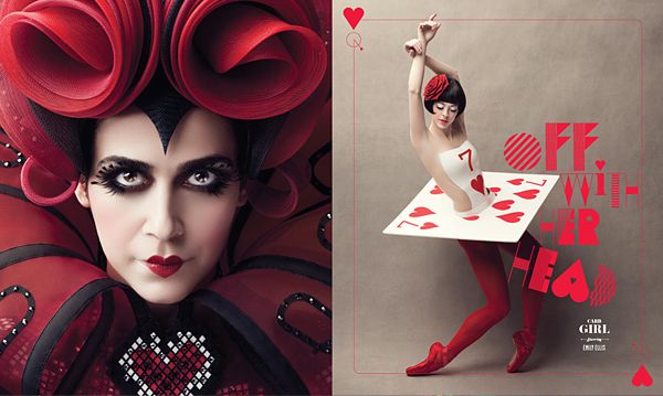 To help the Ballet paint the town red, the studio created a series of images that highlight the artistry of the dancers and designers. Colors and contours take center stage: Alice’s blonde hair is intentionally a mess—after all she just went down a rabbit hole. The White Rabbit is leaping (not hopping) because he’s running late. The Mad Hatter is truly mad—no one knows if it’s the multi-hued jacket he’s wearing or the potent brew in his black-and-white cup. Tweedledee and Tweedledum have a ballet spring to their step. And then there’s the Queen of Hearts, who is seeing red as she demands to know who ate her tarts. Rose petals (and heads) fall around her but the Dancing Card takes her punishment in style with a not-so-lucky number 7 – dripping with red. It’s a dark, deadly wonderland brought to life with a pirouette of vibrant colors.