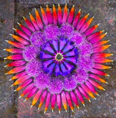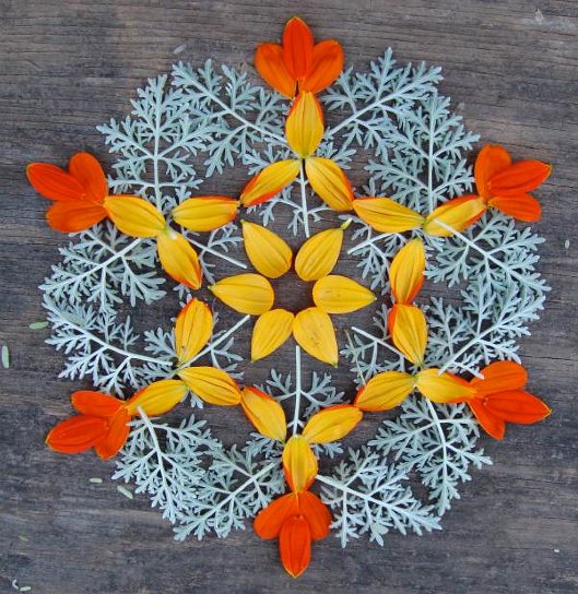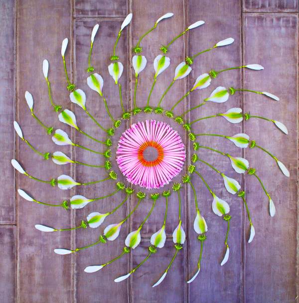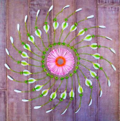 Kathy Klein creates the danmalas by first centering herself in a meditative devotional space. Next she gathers flowers and natural objects while her mind is kept in mantra, resting in the immaterial. Then, through an act of grace and giving to all, she allows the materials to fall to the will of creation patterns. Her inspiration is given from the golden sound residing within perfect silence. They are reflections of the inexpressible, a gesture which points towards life’s abundance, an unspoken verse of Love. The danmalas remind us all to listen to the unheard voice of nature, creation, and the eternal mystery.