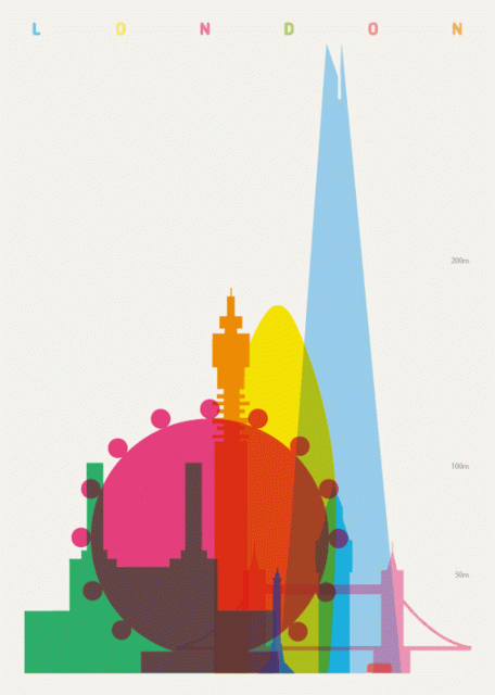 Shape of your Cities it’s a project from Yoni Alter which select the most famous buildings in cities like London, Barcelona, Chicago, Tokyo, New York … vectorizes and turn them into colorful layers that overlap one another, showing the skyline of cities with height proportional occupied by modern buildings, monstrous and sometimes more modest height of buildings and ancient monuments.