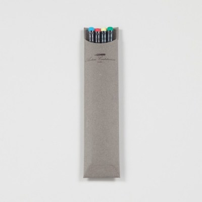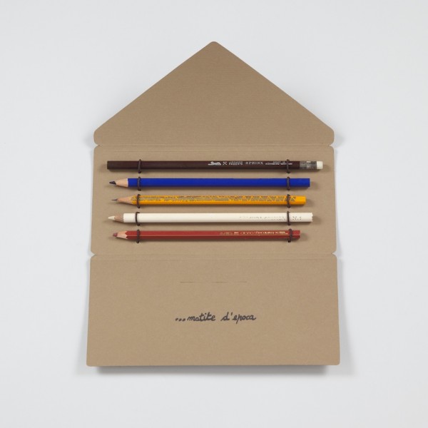 Four black pencils with a selection of coloured erasers. Comes presented in a folder made from vintage cardstock that is 50-60 years old.