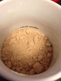 1- Mix the raising flour, sugar and cocoa powder (I use less sugar than the indicate and of course less cocoa powder!)