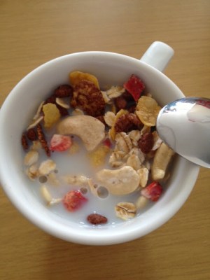 My first mix it has chocolate flakes, raspberries and strawberries and cashew nuts. I enjoy them with cold milk… 🙂