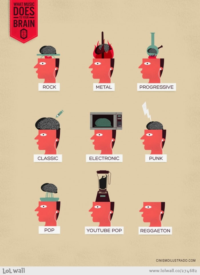 Varis What music does to your brain? by Cinismoilustrado September 26, 2013November 17, 2018 Varietats What music do you listen? This is a funny infographic created by Cinismoilustrado to show you what could make to you every kind of music on your brain… Share this: Click to share on X (Opens in new window) X Click to share on Facebook (Opens in new window) Facebook Like Loading... Related Share this: Click to share on X (Opens in new window) X Click to share on Facebook (Opens in new window) Facebook Like Loading...