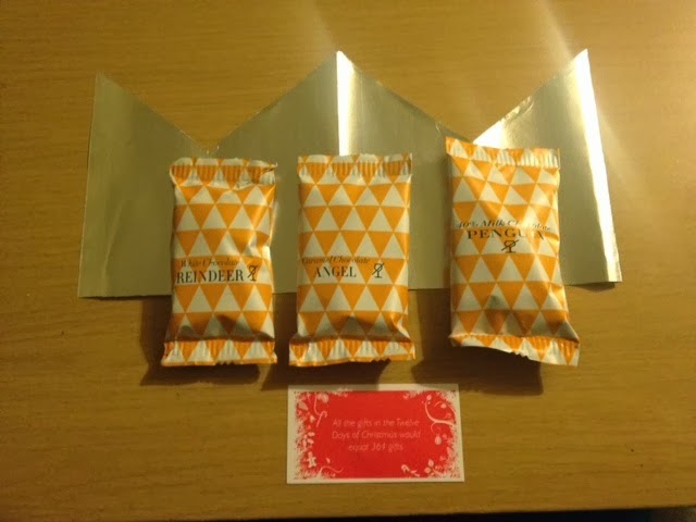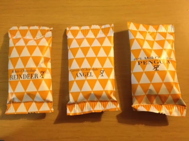 Inside there were 3 chocolates; a white chocolate Reindeer, a Milk Chocolate Penguin and Caramel Chocolate Angel!