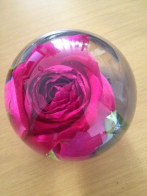 My wedding was in Spain, so I send them my roses via messenger, and today I have received this amazing ball of glass with one of my roses!