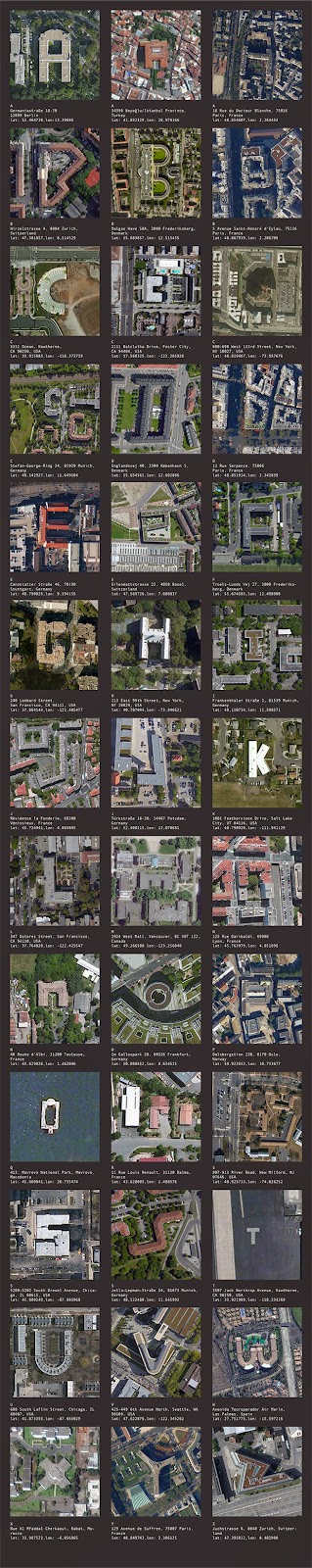 Aerial Bold is the first map and typeface of the earth. The project is literally about “reading” the earth for letterforms, or alphabet shapes, “written” into the topology of buildings, roads, rivers, trees, and lakes. To do this, they will traverse the entire planet’s worth of satellite imagery and develop the tools and methods necessary to map these features hiding in plain sight.