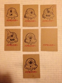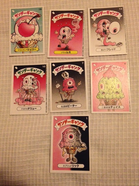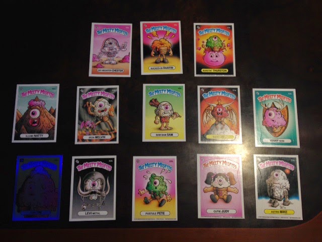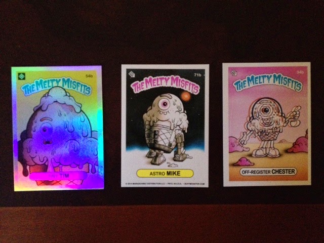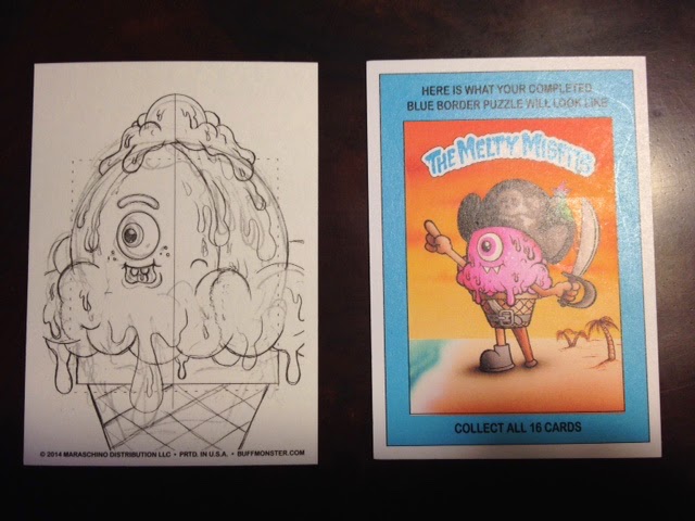 They are the Melty Misfits, a collection of hand-painted cards using acrylic and airbrush on watercolor paper. The backs of the cards feature puzzles and checklists. The backs of the NEW foil cards feature reproductions of the pencil sketches used to paint the cards.