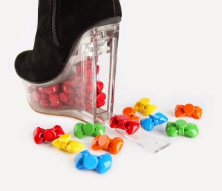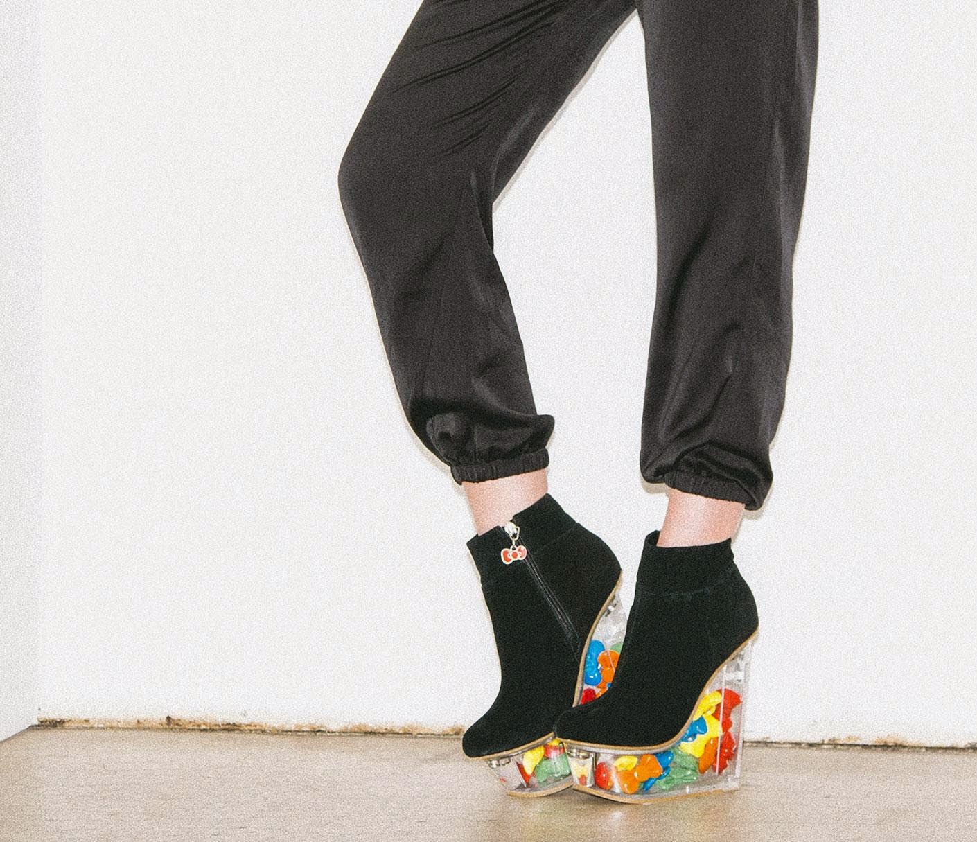They are made with genuine black suede booties and a touch-to-open the perspex Icy wedge heel that you can fill it with the red Hello Kitty bow buttons or multicoloured bow buttons.