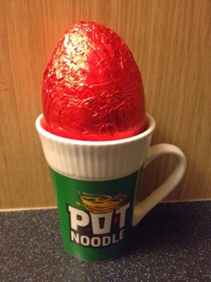 After reading about the Pot Noodle, I couldn’t resist to buy one Egg Pot Noodle to try this original Easter new product… What a deception when I opened the box and I just found an egg milk and a ceramic mug… I want the noodles!!