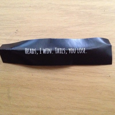 They are black, but very tasty, and the note inside is just for tough people… Ready for the misfortune cookies? I advise you, you will have your tongue black after eating them! 🙂