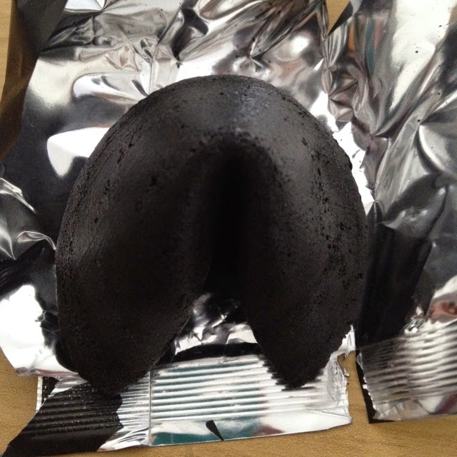 They are black, but very tasty, and the note inside is just for tough people… Ready for the misfortune cookies? I advise you, you will have your tongue black after eating them! 🙂
