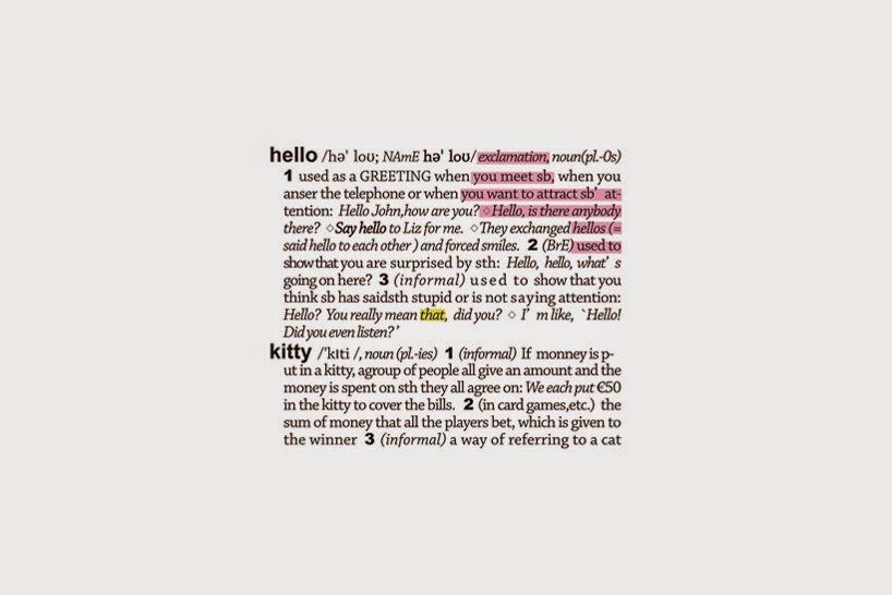 The design features dictionary extracts with the definitions of “hello” and “kitty”, highlighted in pink and yellow to represent Kitty’s ribbon and nose respectively.