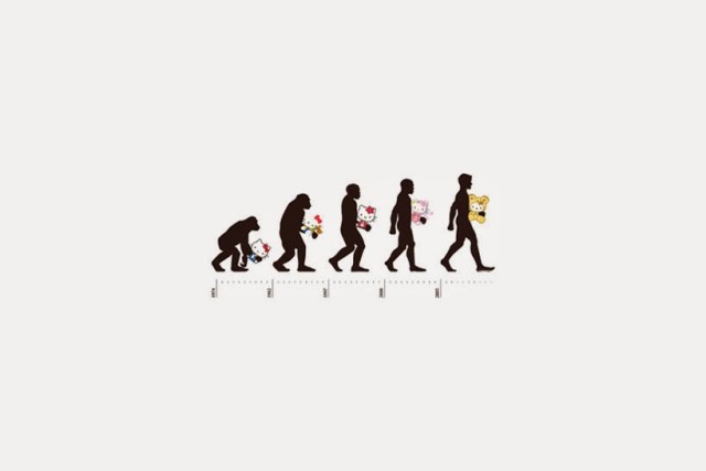 Since her debut in 1974, Hello Kitty has been subtly evolving through the years, incorporating design trends concerning her contours, three-dimensionality and facial features. The design draws attention to Kitty’s continuous evolution, by superimposing her on the classic illustration depicting human evolution.