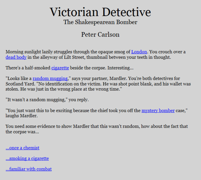 Curiosities Victorian Detective April 25, 2015November 17, 2018 Varietats Want to be a detective? With Text Adventure, you will have an internal monologue that will guide you in this Victorian Detective! Here’s the first chapter… Share this: Click to share on X (Opens in new window) X Click to share on Facebook (Opens in new window) Facebook Like Loading... Related Share this: Click to share on X (Opens in new window) X Click to share on Facebook (Opens in new window) Facebook Like Loading...