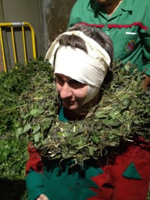 Then, they cover the head with gauze to hold the mask correctly onto the face. Between the mask and the costume, they wear a green plant (Clematis vitalba) wreath to protect the “Ple” from the fire.