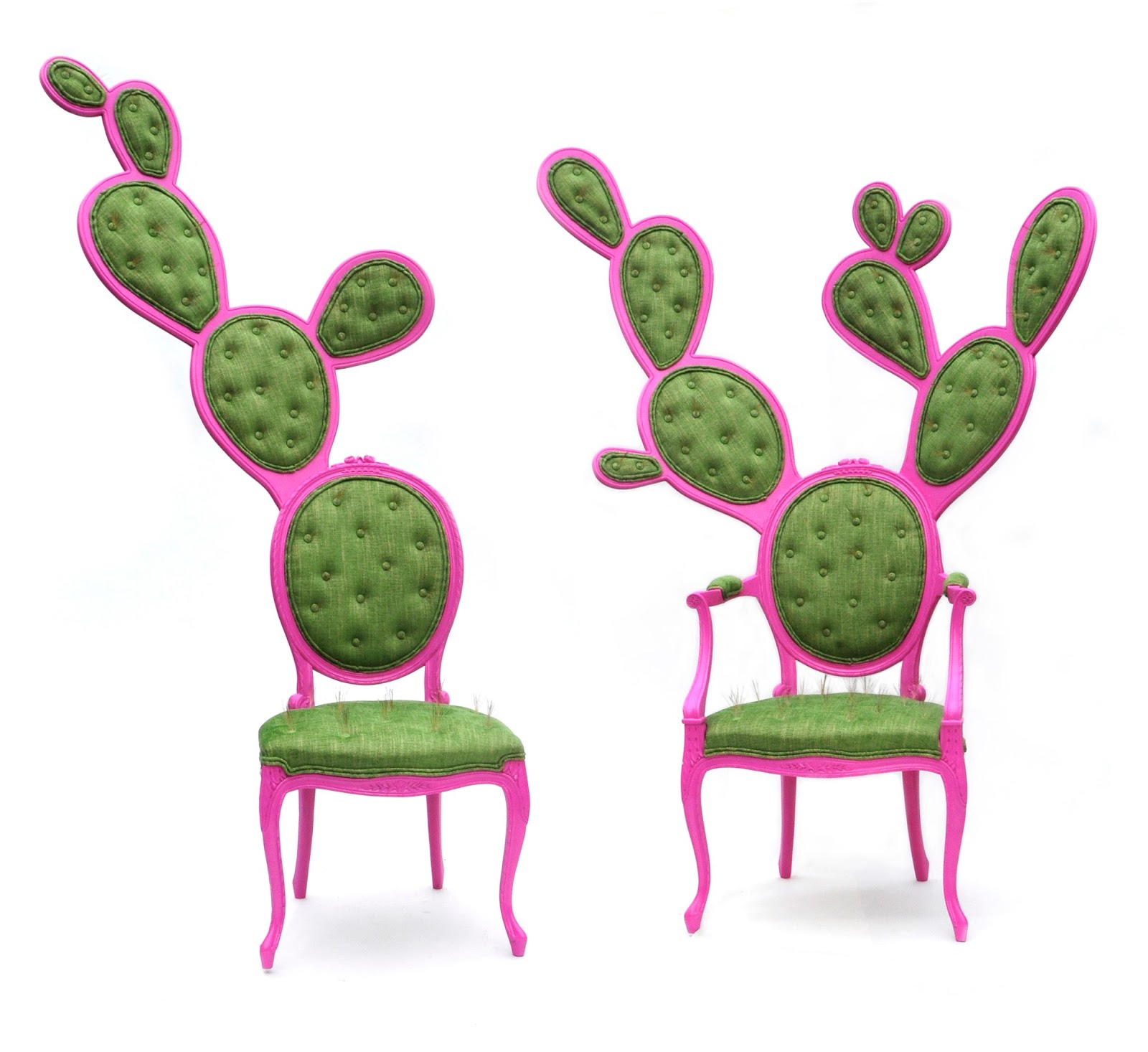 The Prickly Pair Chairs are a cultural blend of Mexican and European influences. The classical French Louis XV chair has been transformed into an avant-garde cactus design with traditional French buttoned upholstery detail.