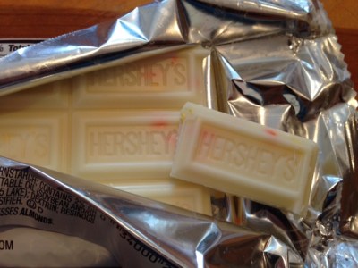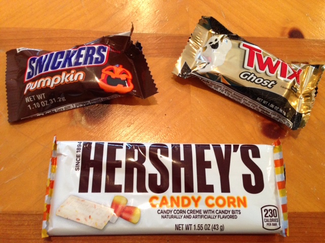 The Hershey’s Candy Corn is a sweet white chocolate bar with small bits of candy corn!