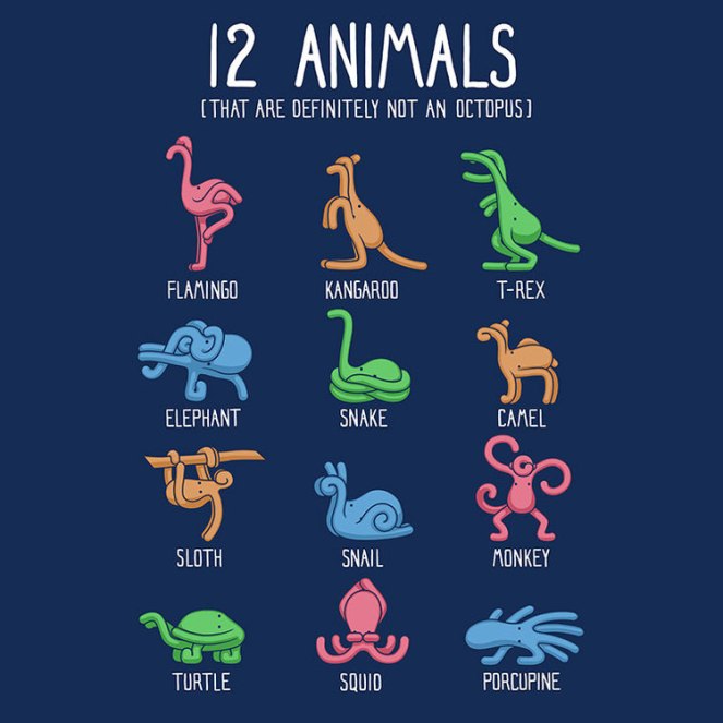 Curiosities · Posters 12 Animals (That are not definitely and octopus) by Gabe Pyle July 4, 2016November 17, 2018 Varietats Can you see the octopus in these 12 animals?The original idea is from the artist Gabe Pyle. The source is Bored Panda. Share this: Click to share on X (Opens in new window) X Click to share on Facebook (Opens in new window) Facebook Like Loading... Related Share this: Click to share on X (Opens in new window) X Click to share on Facebook (Opens in new window) Facebook Like Loading...