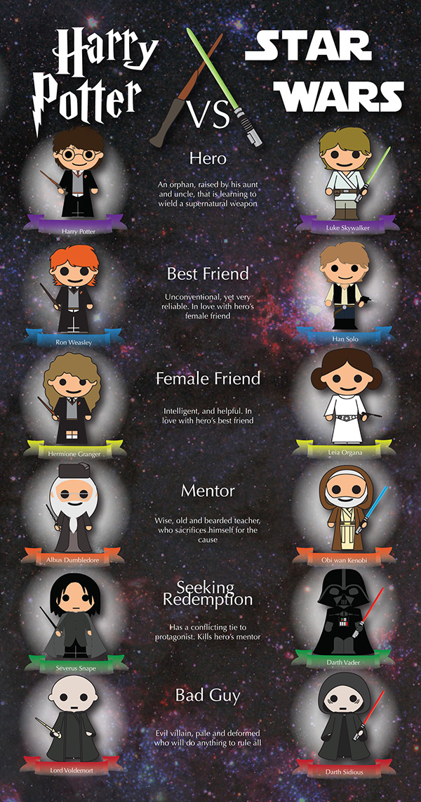 Mary Brown created an eye catching and entertaining infographic in Kelley Coppinger’s senior level class. She highlights the extreme similaries of two very popular sci-fi series, Harry Potter and Star Wars, by comparing the character roles of each storyline.