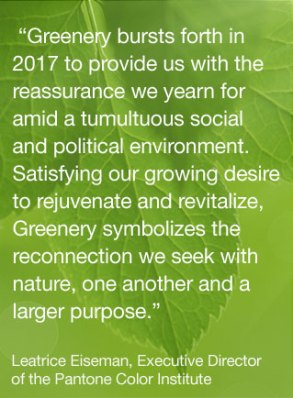 A refreshing and revitalizing shade, Greenery is symbolic of new beginnings.