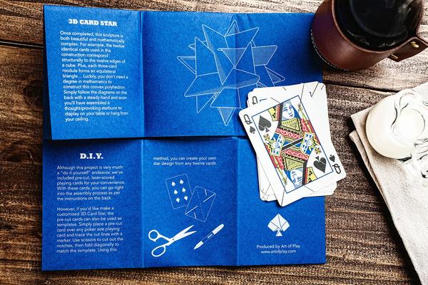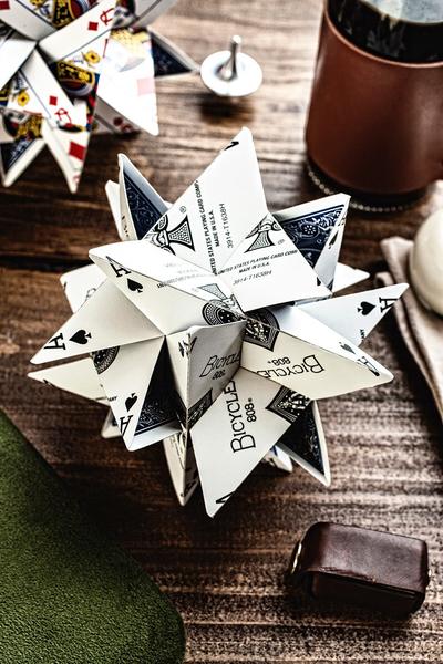 \Take a look at this cute star made of playing cards, created by Professor George W. Hart, co-founder of the Museum of Mathematics in New York City. Once assembled, the dozen pre-cut playing cards included will lock together to create a 5.5″ tall starburst.
