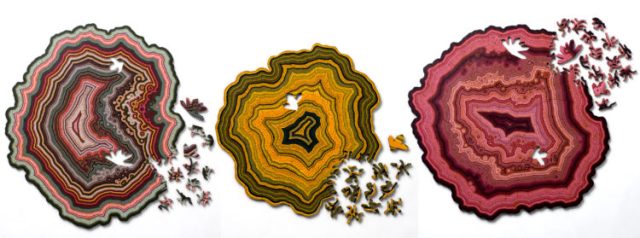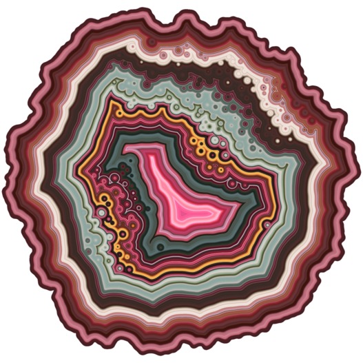 They Geode is a jigsaw puzzle inspired by the formation of agate, a colorful banded stone. Each puzzle is unique, emerging from a computer simulation that creates natural variations in the shape, pieces, and image. Hundreds of lasercut plywood pieces intertwine to form a challenging, maze-like puzzle. Each geode is a slice of an algorithmic rock.