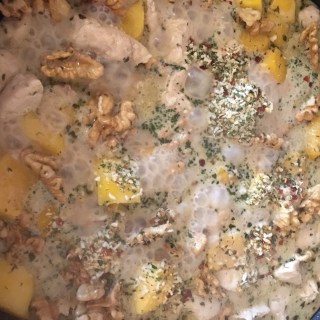 - Add the Thai Green Paste, fry for 2 minutes and add the mango and the walnut.