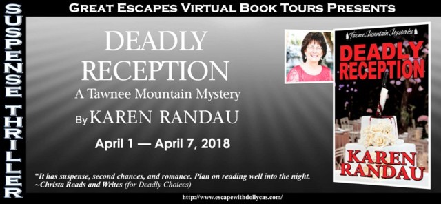 First of all, Deadly Reception by Karen Randau is a part of the Tawnee Mountain Mysteries series, a collection of seven brand new mysteries, from seven award-winning and bestselling authors, taking place at the same final destination, the Tawnee Mountain Resort.