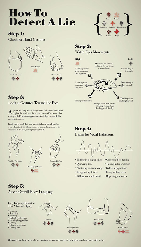 I’ve always been fascinated by how you could detect if someone is telling the truth or not, there’s a science behind this, and I have to admit I don’t have much time to read something that is not my loving thriller/crime/mystery books, so when I discovered this useful infographic with some easy tricks to detect a lie by the artist Lisa Woomer, I thought it would be interesting to share it with you, take a look…