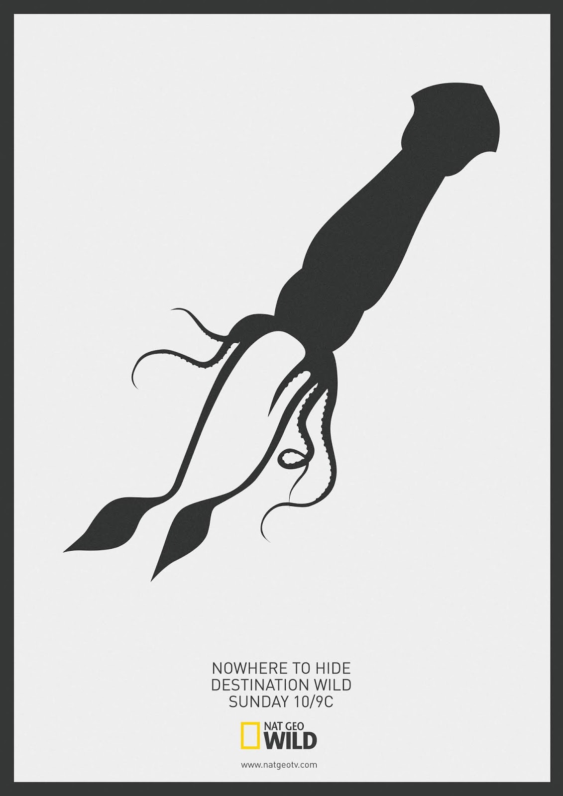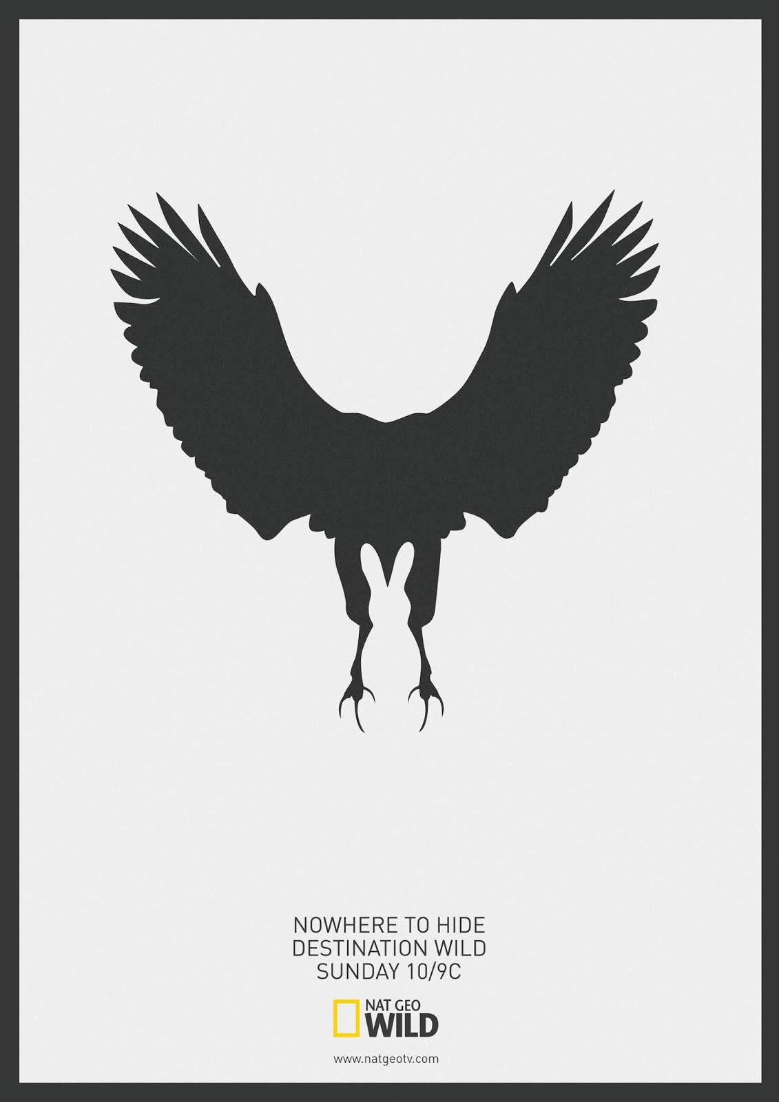 Combining both predators and their prey into a single canvas using negative space to express the predatorial and vulnerable glory. The posters feature animals and visual tricks, such as the outline of an unsuspecting bunny rabbit between the legs of a bird of prey, and a giant squid using its tentacles to form part of the outline of a sperm whale.