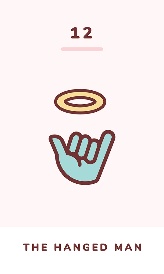 The Hanged Man, finding a small window between the spiritual and material, reaches enlightment. Although this state is temporary, it changes him forever. This card can represent a feeling of seeing the world as upside-down and of finding peace in being able to not take it too seriously. If you get this card in a reading, suspend your judgement (and sense of time) to try out different perspectives.