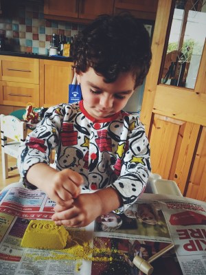 The two piece I tried were from two different brands, the Dig a Diamond (by Science by Me) and Dig Gold (by Mine It). Both toys are for children older than 6 years, so when I used with my little one (he is just 30 months) I was all the time checking him. The tools could be dangerous without adult supervision all time and the sand could be toxic to eat, so if you try these toys with your little ones, keep them vigilant all time!