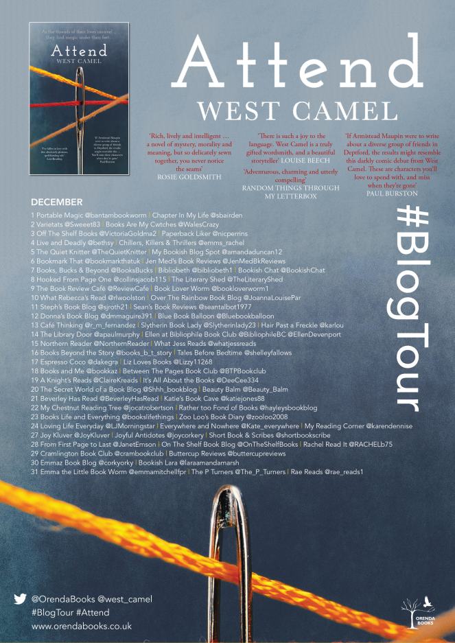 Born and bred in south London – and not the Somerset village with which he shares a name – West Camel worked as an editor in higher education and business before turning his attention to the arts and publishing. He has worked as a book and arts journalist, and was editor at Dalkey Archive Press, where he edited the Best European Fiction 2015 anthology, before moving to new press Orenda Books just after its launch. He currently combines his work as editor at Orenda Books with writing and editing a wide range of material for various arts organisations, including ghost-writing a New-Adult novel and editing The Riveter magazine for the European Literature Network. He has also written several short scripts, which have been produced in London’s fringe theatres, A highly anticipated debut, blending the magical realism of Angela Carter and the gritty authenticity of Eastenders and was longlisted for the Old Vic’s 12 playwrights project. Attend is his first novel.