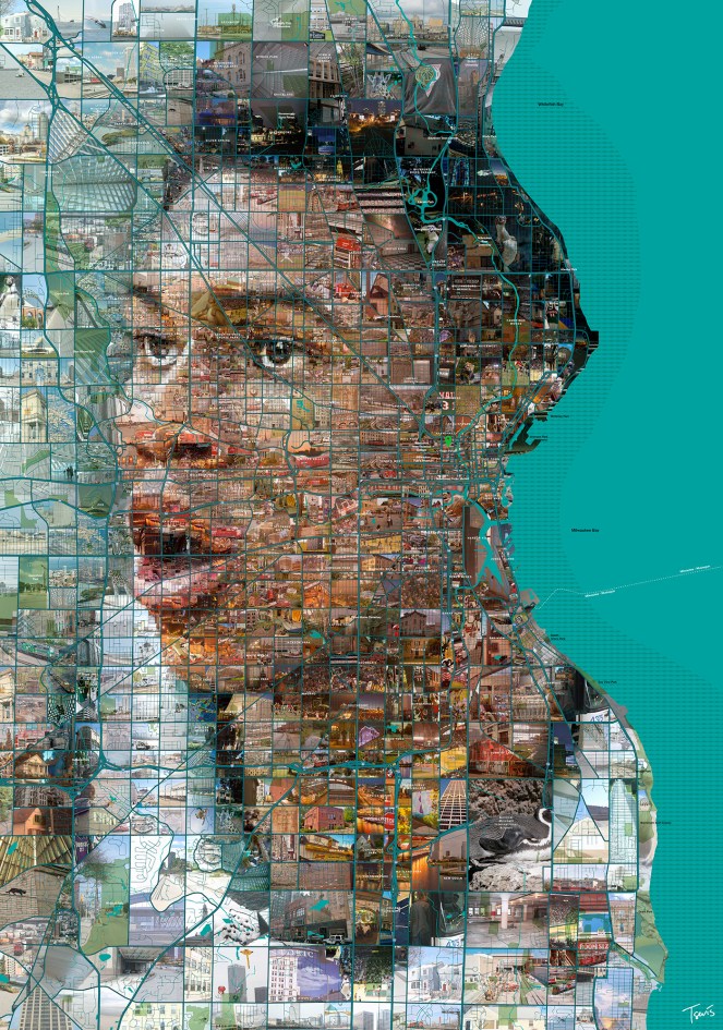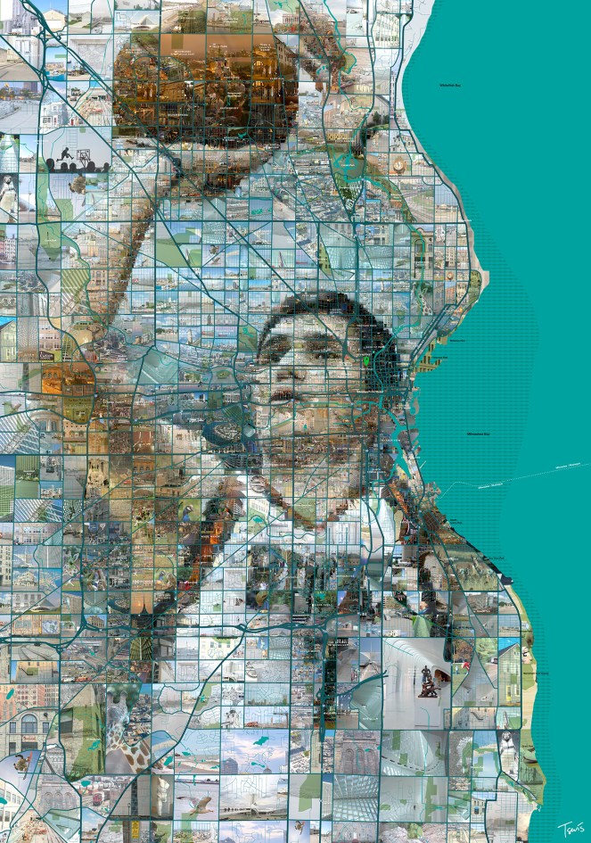 “Mosaic portrait of Milwaukee Bucks player using the actual map of the Metropolitan area of Milwaukee as the grid where they are constructed upon.Thousands of Milwaukee photos are used to fill the gaps between the streets.”