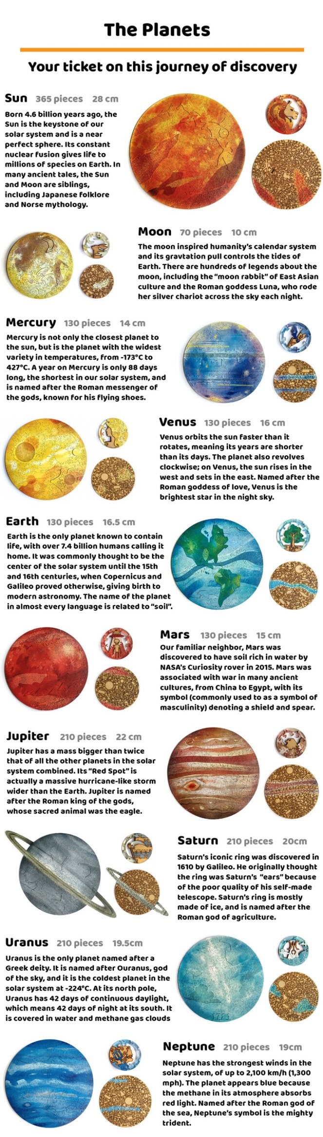 This is not only a beautiful puzzle, it’s made with high quality products and precision-cut materials. Making the pieces fit perfectly with each other without any faults in them. The pieces are made with blend of wood and the transparent acrylic pieces allow light to pour though some planets.