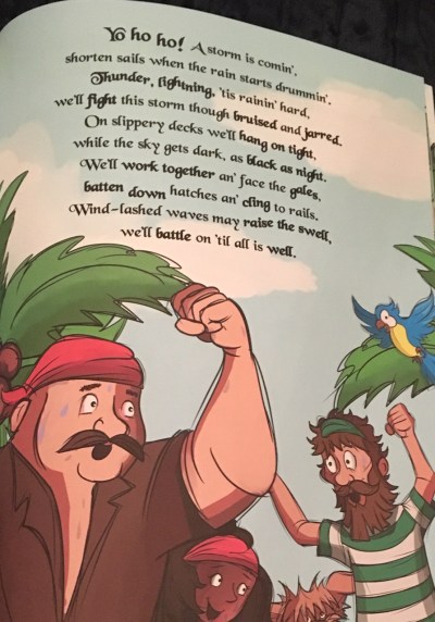 So let’s talk a little bit about A Pirate’s Song by Justin Davis, is an adventure, a search for a pirate’s treasure, with a full pirate crowd! Ready?