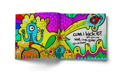 Working in a graffiti inspired style we’ve created a surreal world in which our tribe go on a quest which sees them meeting giant dogs, jumping through cakes and listening to snakes playing records.