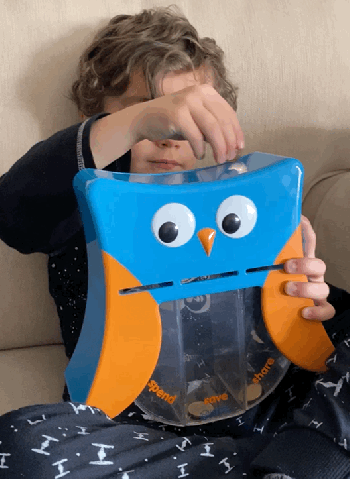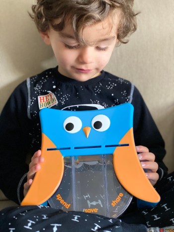 There are three transparent drawers: one to spend, one to save and one to share. In the beginning I wasn’t sure if the drawers would resist my little one manners and that would get loose, but they have a little stop in the end and they stick on their place perfectly! And you can throw the money and let the owl decide where to go or on the front choosing exactly where you want to put the money.