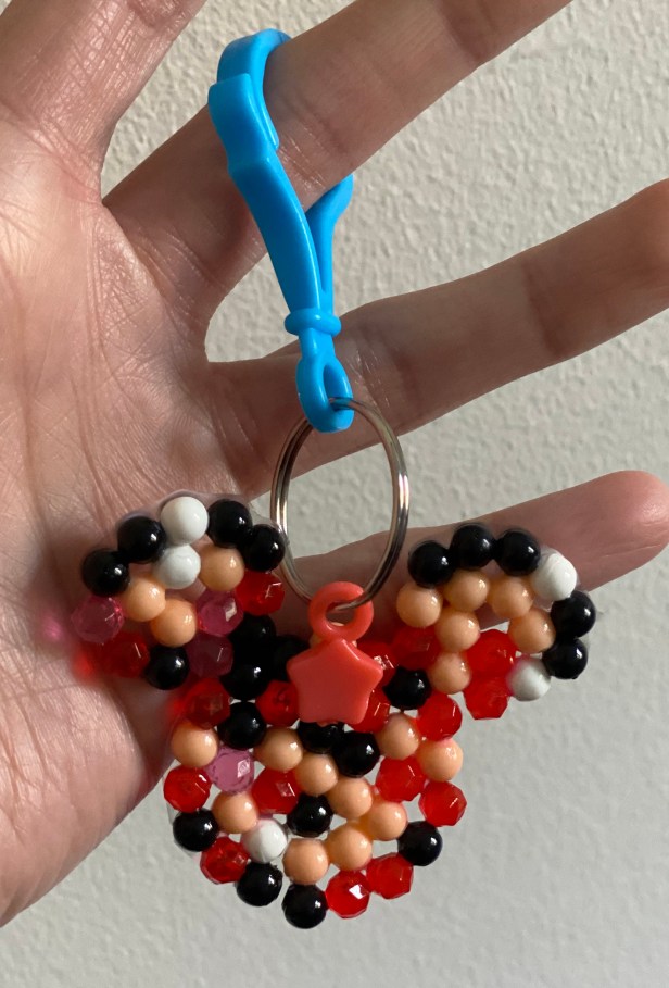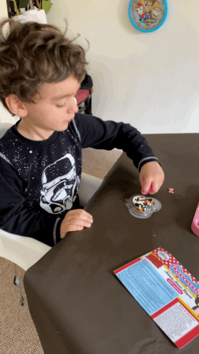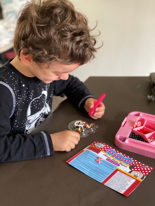 I’ve been following Aquabeads on Twitter for a long time and I always envy all the cute Disney packages they have! So, when I found the Minnie Mouse playset I couldn’t resist to buy it and try to do it with my son! I’ll say from the beginning that it was a hit, we saw Minnie in DisneyWorld Orlando and he really likes Minnie and Mickey! So trying to do the famous ears with little beads was super exciting for him. I normally try to help him with the colours and being careful with what he does, but I thought that this was his moment to simply put beads and then “magically” see the ears become a keychain. Just a little reminder, this is not a toy for little ones, there are really small pieces that can be really dangerous.