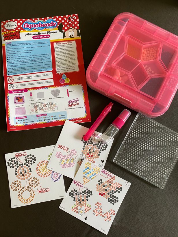 Is is a really easy to use toy (and really worth the money!), it has all the things you need to do a few Minnie things (ears and ice-cream included!). There are some different coloured beads (some colours have more beads than others, but it’s not much important), some laces and stars to add to your creations, a pen to make it easily to put the beads on the plastic and some patterns to follow to make your Minnie creations.