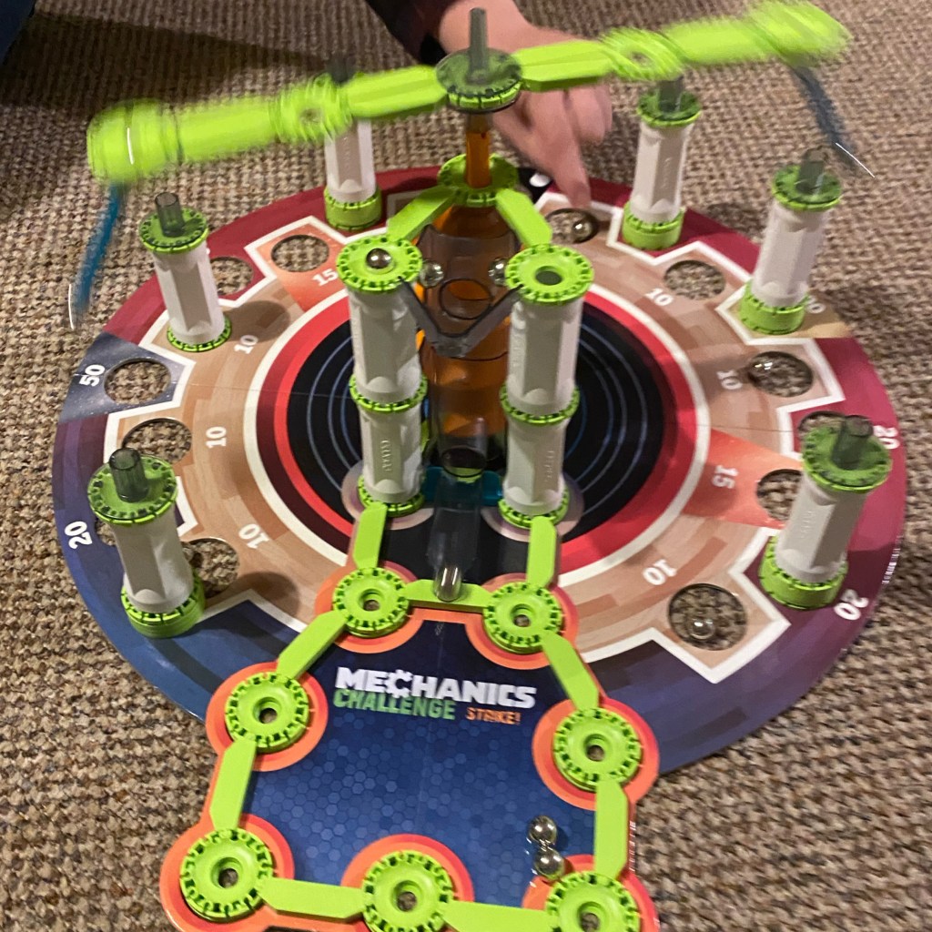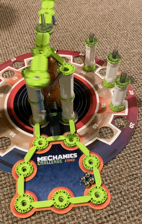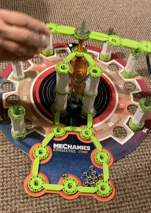 Once it’s mounted, it comes the funny part; not the easy part, because believe me when I say that it’s not easy to win, but it’s really fun! The main part of the game is to throw the ball into the little basket to make the big part start moving, so the faster the part moves, it is easier to make the towers fall down. So, you have to keep scoring to win the game!