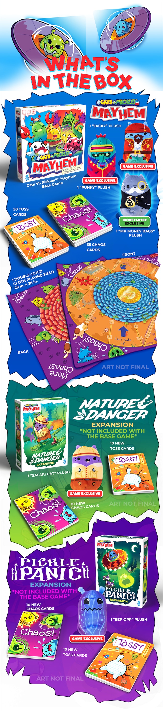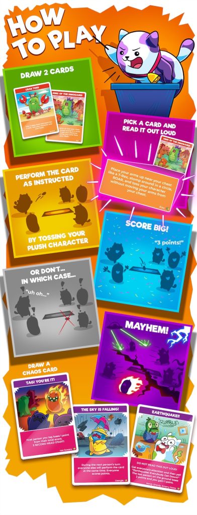 Cats VS Picklesâ„¢: Mayhem! is a Fast, Fun , and Frantic Card game that involves tossing your favorite, award winning, Cats VS Picklesâ„¢ plush onto a field to score points. There IS a catch though! Toss cards tell you a specific way on how to toss your plush. And if you miss a scoring zone, then its time to draw a Chaos Card! Wacky mayhem happens when these are drawn. It’s a blast for all ages!Cats VS Picklesâ„¢: Mayhem is a very easy game to play and can be taught to a new player in under 30 seconds. It’s THAT simple.