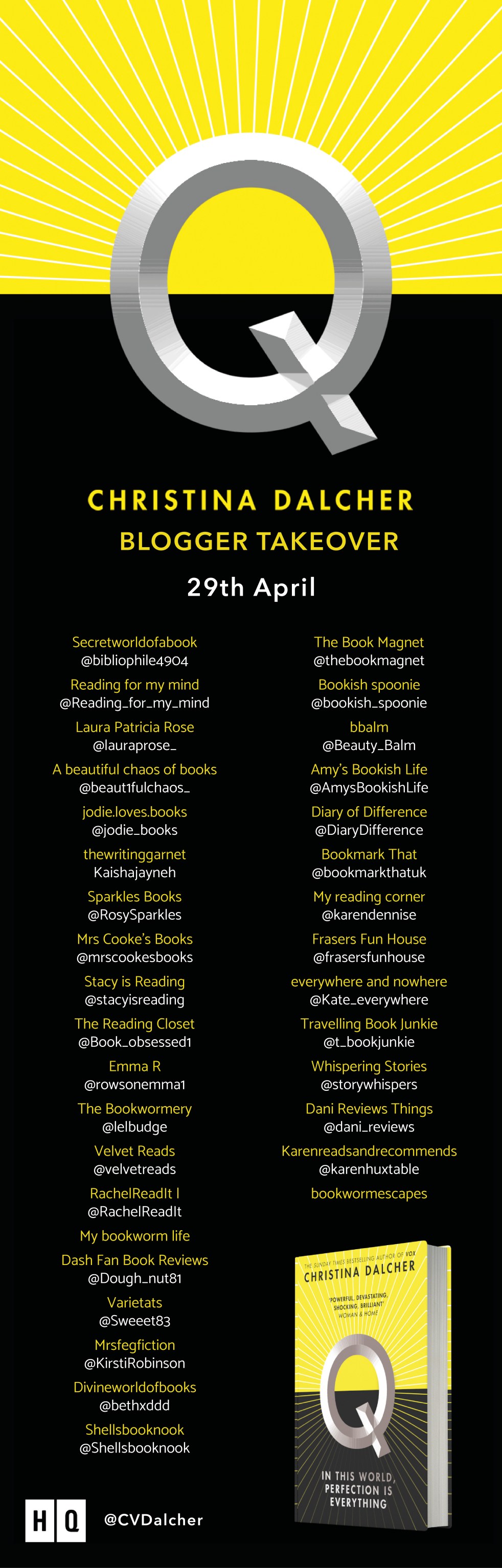 Ready to enjoy an amazing read this 2020? Take a look at this great book… Q by Christina Dalcher Genre: Dystopian, Fiction, Thriller Publisher: HQ Stories Rating: 5/5 Amazon, Hive About The Book Elena Fairchild is a teacher at one of the state’s new elite schools. Her daughters are exactly like her: beautiful, ambitious, and perfect. A good thing,… Continue reading Q by Christina Dalcher – Blog Tour