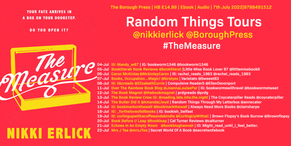 Ready to discover another great book for this 2022? Take a look… The Measure by Nikki Erlick Genre: Dystopian, Ficton, FantasyPublisher: HarperCollins PublishersSource: Random Things ToursRating: 4/5Amazon, Hive, Waterstones About The Book Your fate arrives in a box on your doorstep. Do you open it?It’s the decision of a lifetime. It seems like just another morning. You make a cup of tea. Check the… Continue reading The Measure by Nikki Erlick – Blog Tour