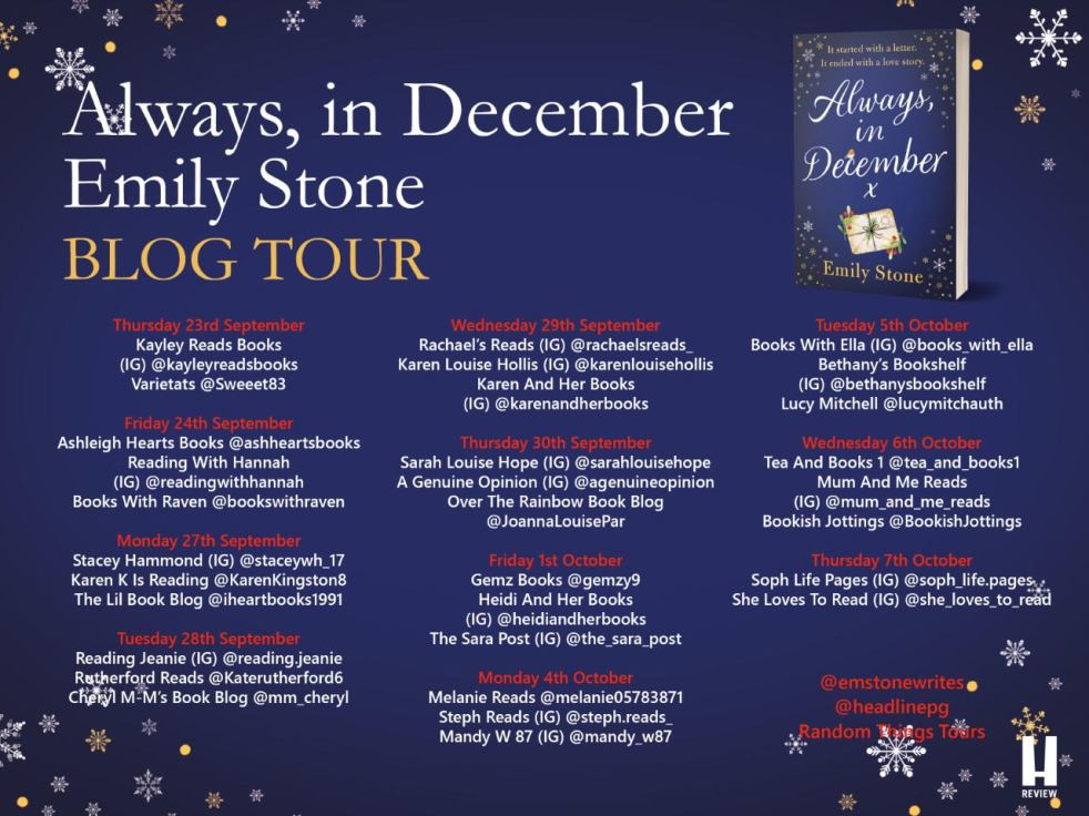 Ready to discover another great book for this 2021? Take a look… Always In December by Emily Stone Genre: Fiction, RomanceSource: Random Things ToursRating: 4/5Publisher: Headline BooksAmazon, Hive About The Book Josie Morgan never looks forward to December. It’s always a reminder of the life she lost, twenty years ago. Now, she always switches off the radio when Christmas music comes on.… Continue reading Always In December by Emily Stone – Blog Tour